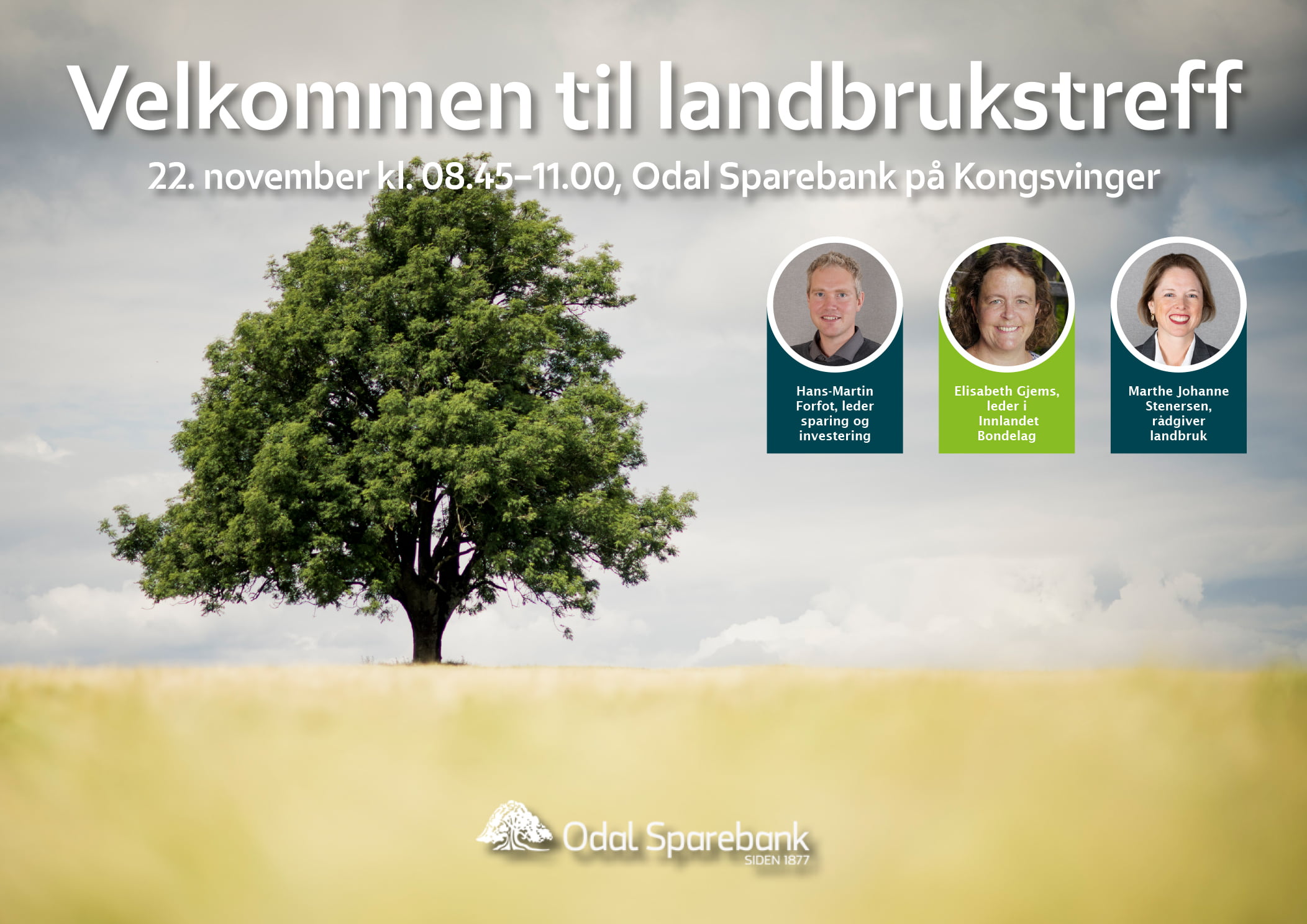 Landbrukstreff 22. november Vi inviterer til landbrukstreff i Odal Sparebanks lokaler i 2. etasje i EPA-bygget på Kongsvinger, fredag 22. november kl. 08.45-11.00. Les mer